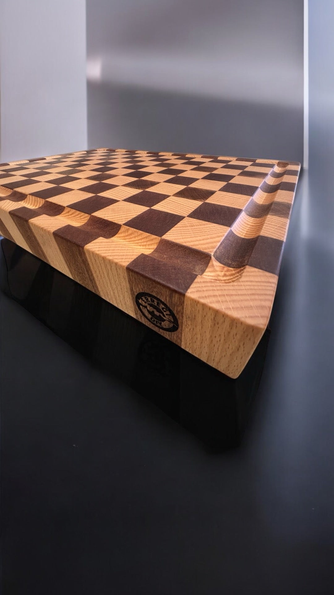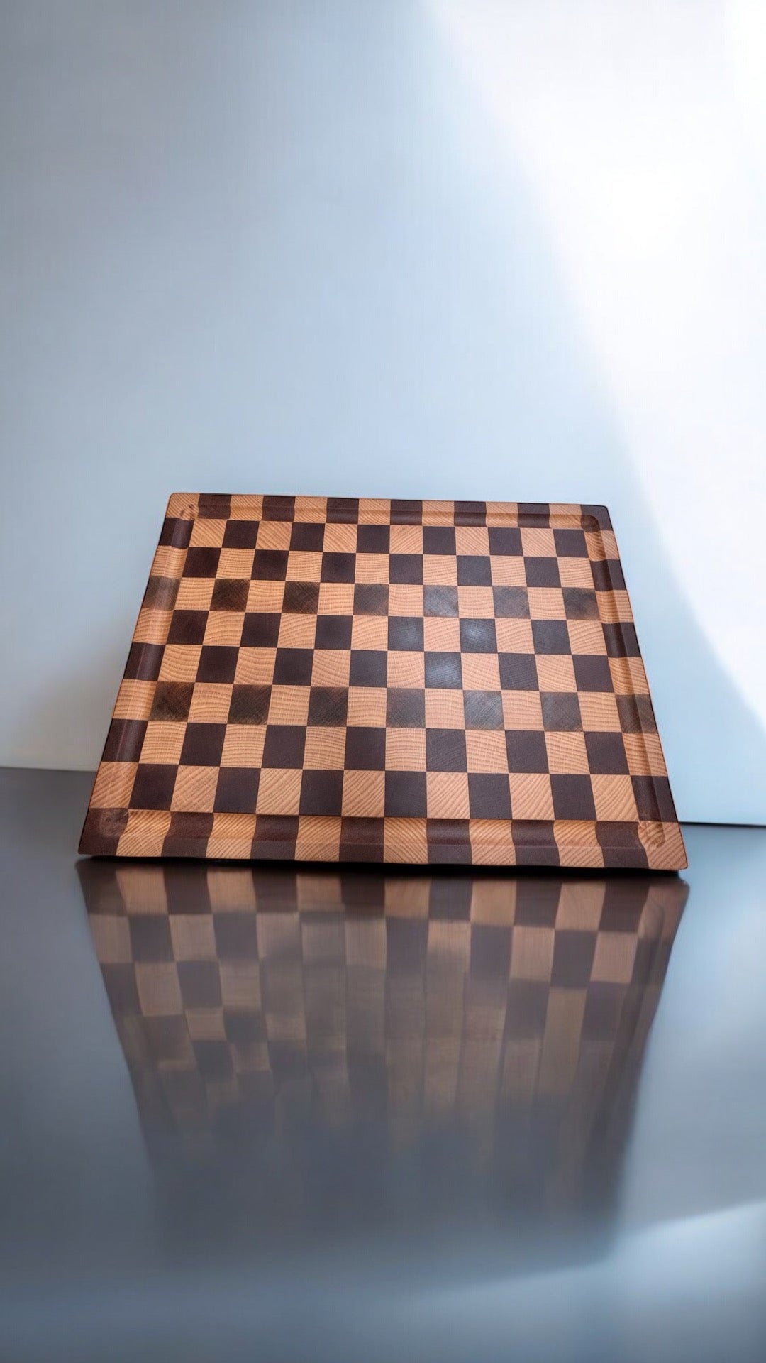 Tagliere a scacchi con scolo per la raccolta dei succhi, maniglie e gommini antiscivolo. Perfetto per i tuoi bbq grazie alle dimensioni generose 47x34